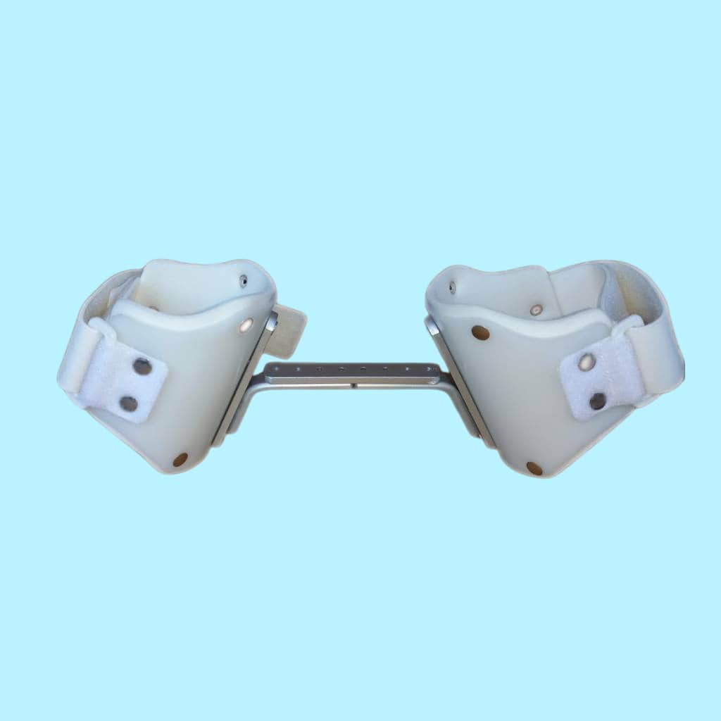 A hip abduction leg brace is an orthopedic device used to maintain the hips in an abducted position, where the legs are spread apart to ensure proper alignment of the hip joint. It is commonly prescribed for conditions such as hip dysplasia in infants, post-surgical recovery, or to manage hip contractures. The brace typically includes an adjustable bar connecting the legs, ensuring stability and promoting joint health while allowing limited movement. It is designed to facilitate proper hip alignment during the healing process or developmental correction.